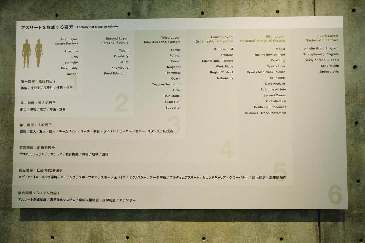 内容は、アスリートの躍動する身体を映像や写真で紹介するほか、体感型の展示を通して、身体や心理をコントロールする知覚、戦術における情報解析の先端技術、そして身体拡張を支えるスポーツギアなど、トップアスリートの「反応し、考え、行動に移す」を体感・体験する構成。歩くや握るといった、普段の何気ない動作のひとつひとつにも生じる、自分の中のアスリート性を発見する展示となっている。